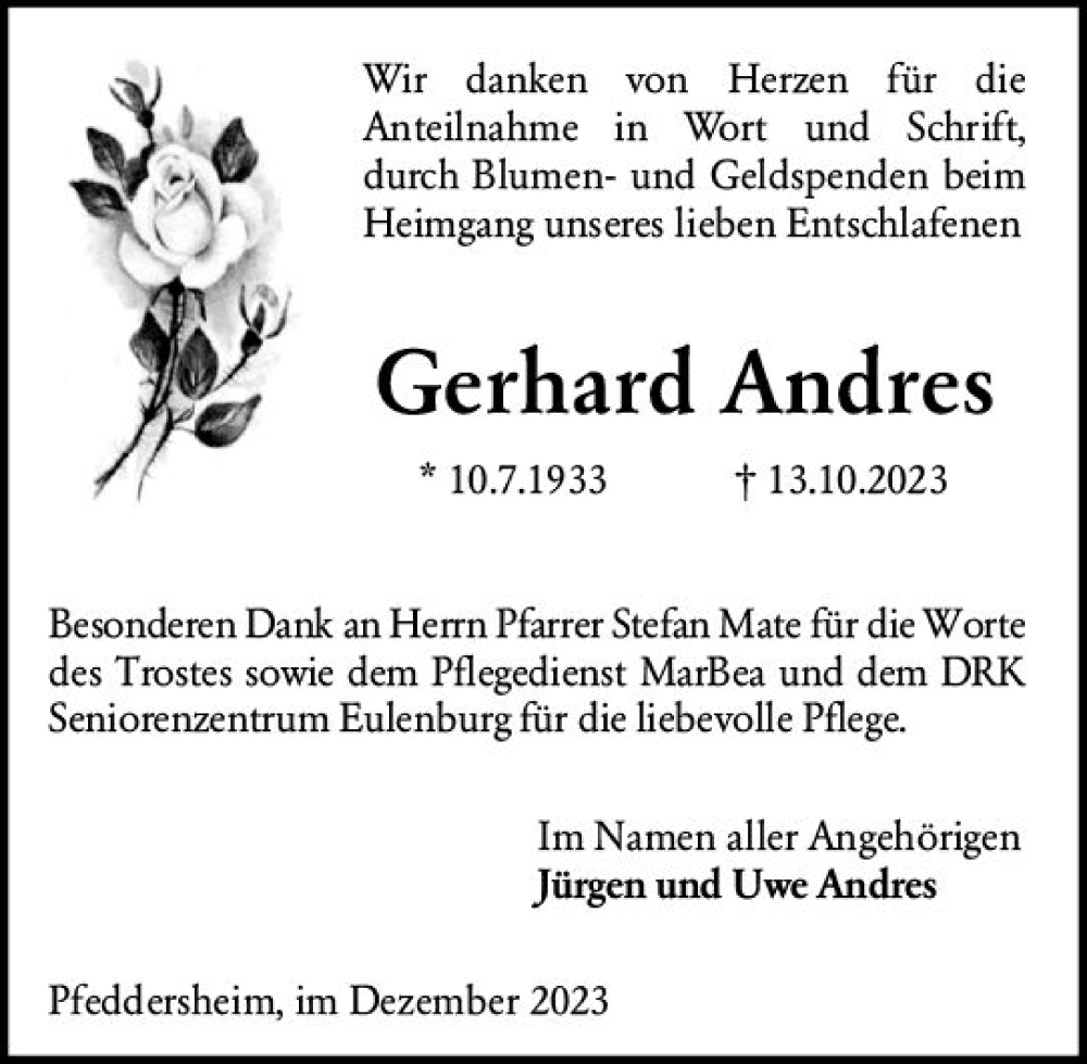 Hier finden Sie alle Traueranzeigen aus der Zeitung, die bisher für Gerhard Andres erschienen sind. Weitere Traueranzeigen, die in der Zeitung erscheinen, werden hier ebenfalls aufgelistet