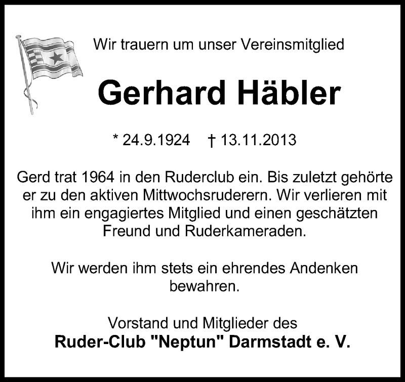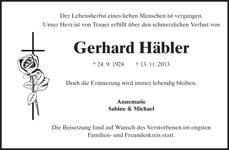 Hier finden Sie alle Traueranzeigen aus der Zeitung, die bisher für Gerhard Häbler erschienen sind. Weitere Traueranzeigen, die in der Zeitung erscheinen, werden hier ebenfalls aufgelistet
