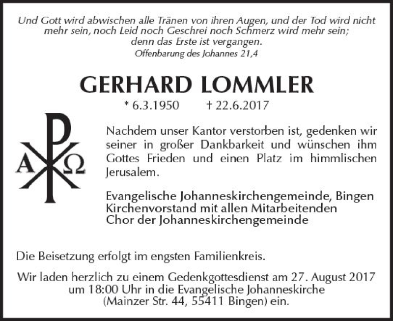 Hier finden Sie alle Traueranzeigen aus der Zeitung, die bisher für Gerhard Lommler erschienen sind. Weitere Traueranzeigen, die in der Zeitung erscheinen, werden hier ebenfalls aufgelistet