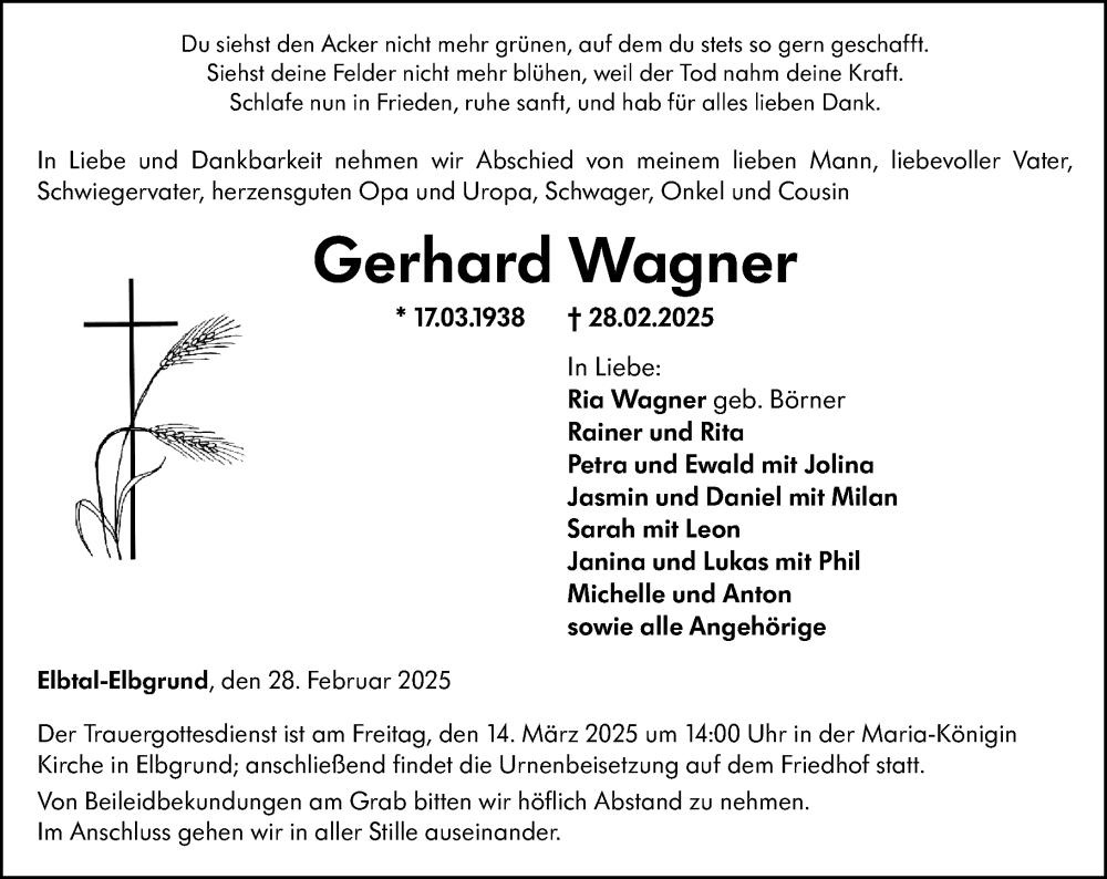 Hier finden Sie alle Traueranzeigen aus der Zeitung, die bisher für Gerhard Wagner erschienen sind. Weitere Traueranzeigen, die in der Zeitung erscheinen, werden hier ebenfalls aufgelistet