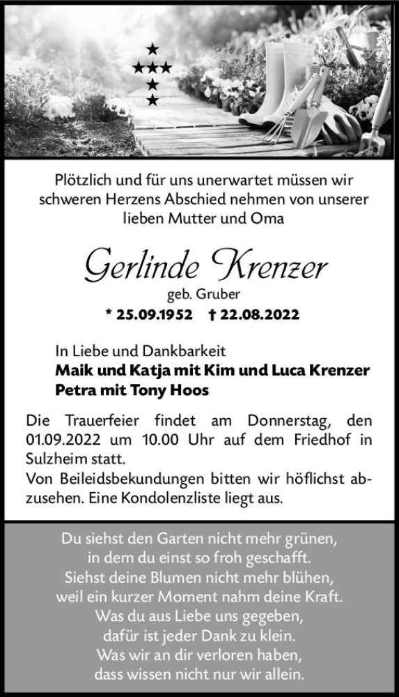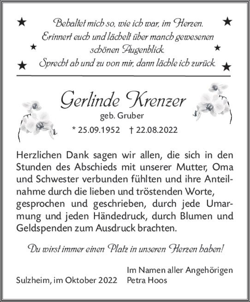 Hier finden Sie alle Traueranzeigen aus der Zeitung, die bisher für Gerlinde Krenzer erschienen sind. Weitere Traueranzeigen, die in der Zeitung erscheinen, werden hier ebenfalls aufgelistet