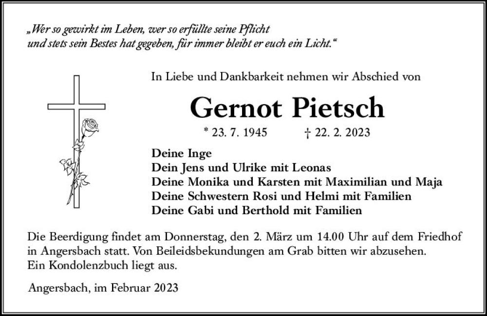 Hier finden Sie alle Traueranzeigen aus der Zeitung, die bisher für Gernot Pietsch erschienen sind. Weitere Traueranzeigen, die in der Zeitung erscheinen, werden hier ebenfalls aufgelistet