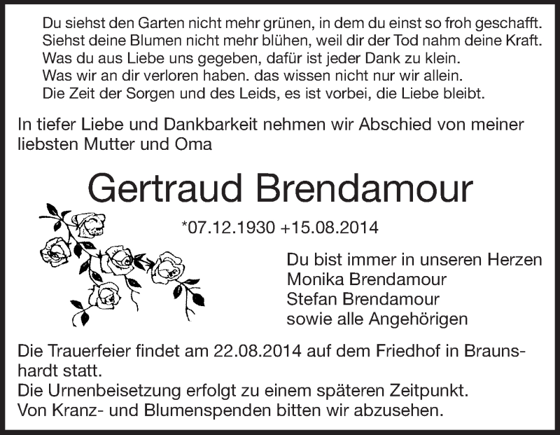 Hier finden Sie alle Traueranzeigen aus der Zeitung, die bisher für Gertraud Brendamour erschienen sind. Weitere Traueranzeigen, die in der Zeitung erscheinen, werden hier ebenfalls aufgelistet