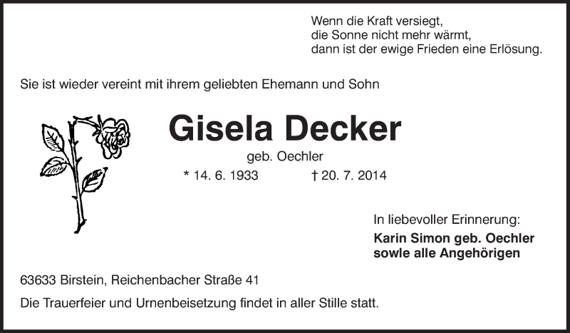 Hier finden Sie alle Traueranzeigen aus der Zeitung, die bisher für Gisela Decker erschienen sind. Weitere Traueranzeigen, die in der Zeitung erscheinen, werden hier ebenfalls aufgelistet