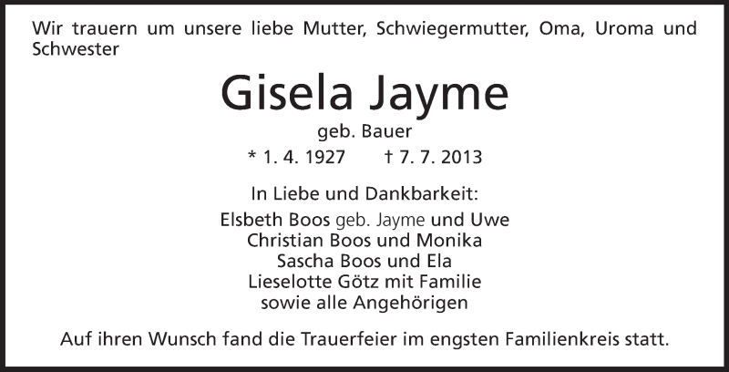 Hier finden Sie alle Traueranzeigen aus der Zeitung, die bisher für Gisela Jayme erschienen sind. Weitere Traueranzeigen, die in der Zeitung erscheinen, werden hier ebenfalls aufgelistet