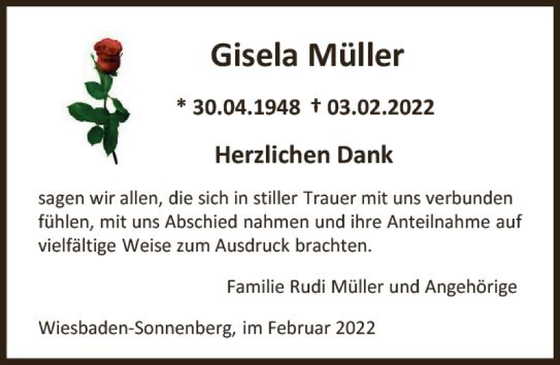 Hier finden Sie alle Traueranzeigen aus der Zeitung, die bisher für Gisela Müller erschienen sind. Weitere Traueranzeigen, die in der Zeitung erscheinen, werden hier ebenfalls aufgelistet