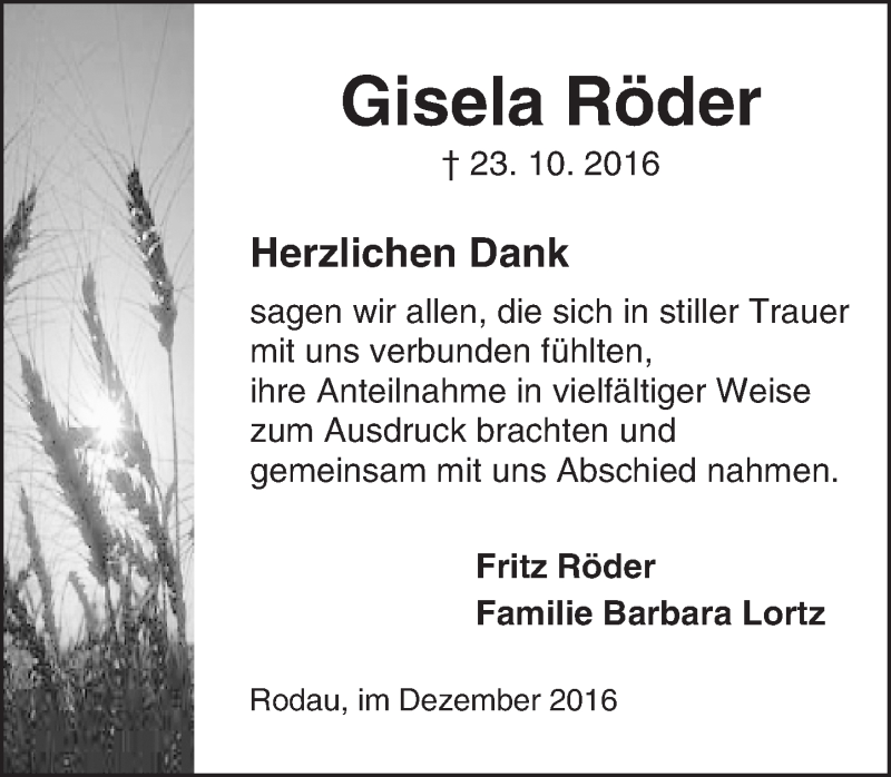 Hier finden Sie alle Traueranzeigen aus der Zeitung, die bisher für Gisela Röder erschienen sind. Weitere Traueranzeigen, die in der Zeitung erscheinen, werden hier ebenfalls aufgelistet