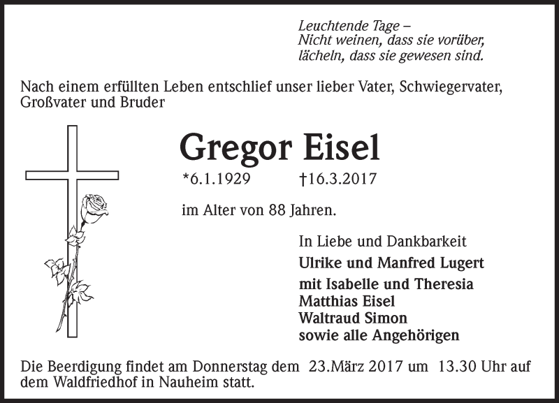 Hier finden Sie alle Traueranzeigen aus der Zeitung, die bisher für Gregor Eisel erschienen sind. Weitere Traueranzeigen, die in der Zeitung erscheinen, werden hier ebenfalls aufgelistet
