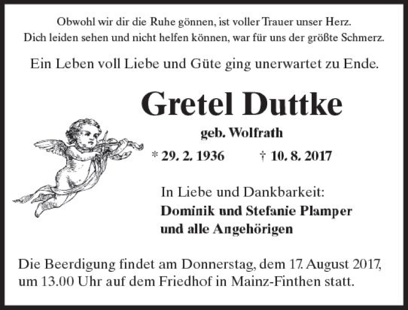 Hier finden Sie alle Traueranzeigen aus der Zeitung, die bisher für Gretel Duttke erschienen sind. Weitere Traueranzeigen, die in der Zeitung erscheinen, werden hier ebenfalls aufgelistet