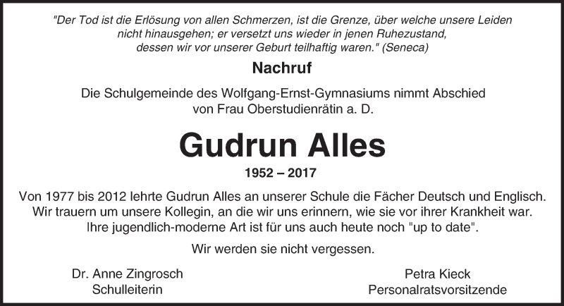 Hier finden Sie alle Traueranzeigen aus der Zeitung, die bisher für Gudrun Alles erschienen sind. Weitere Traueranzeigen, die in der Zeitung erscheinen, werden hier ebenfalls aufgelistet
