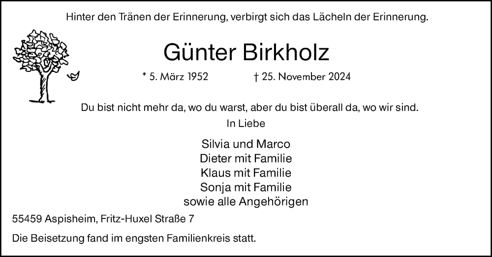 Hier finden Sie alle Traueranzeigen aus der Zeitung, die bisher für Günter Birkholz erschienen sind. Weitere Traueranzeigen, die in der Zeitung erscheinen, werden hier ebenfalls aufgelistet