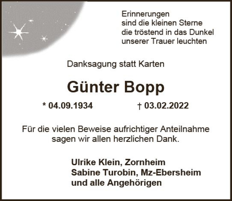 Hier finden Sie alle Traueranzeigen aus der Zeitung, die bisher für Günter Bopp erschienen sind. Weitere Traueranzeigen, die in der Zeitung erscheinen, werden hier ebenfalls aufgelistet