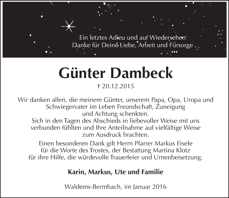 Hier finden Sie alle Traueranzeigen aus der Zeitung, die bisher für Günter Dambeck erschienen sind. Weitere Traueranzeigen, die in der Zeitung erscheinen, werden hier ebenfalls aufgelistet