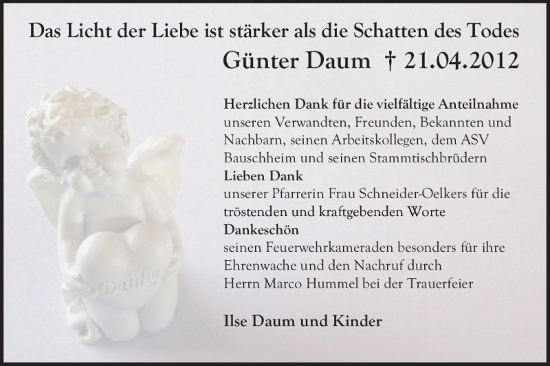 Hier finden Sie alle Traueranzeigen aus der Zeitung, die bisher für Günter Daum erschienen sind. Weitere Traueranzeigen, die in der Zeitung erscheinen, werden hier ebenfalls aufgelistet