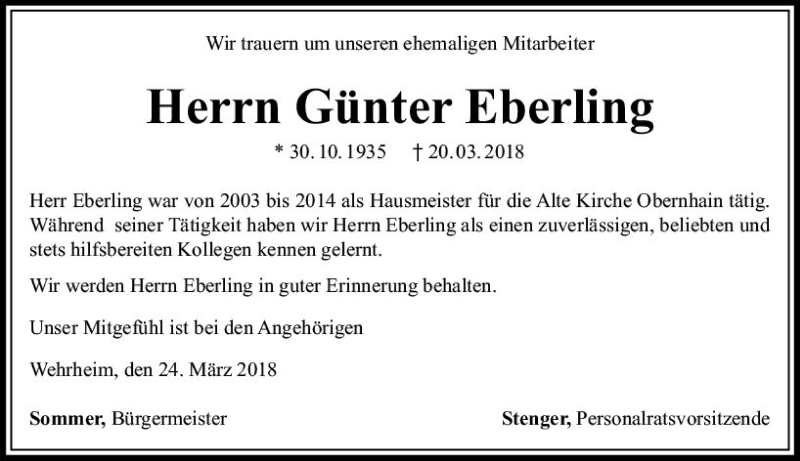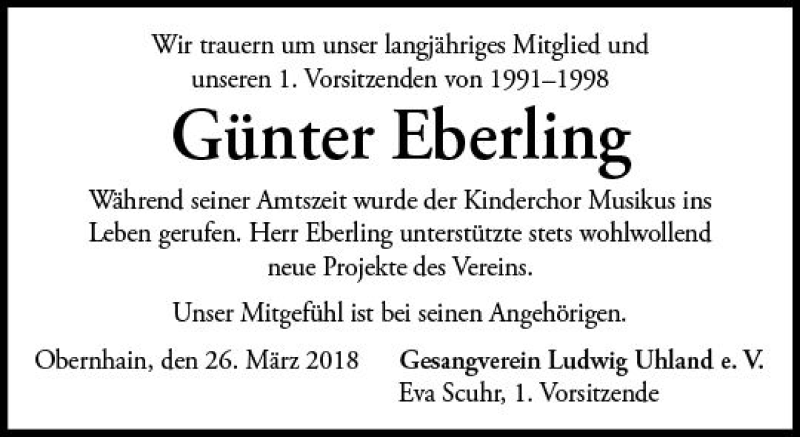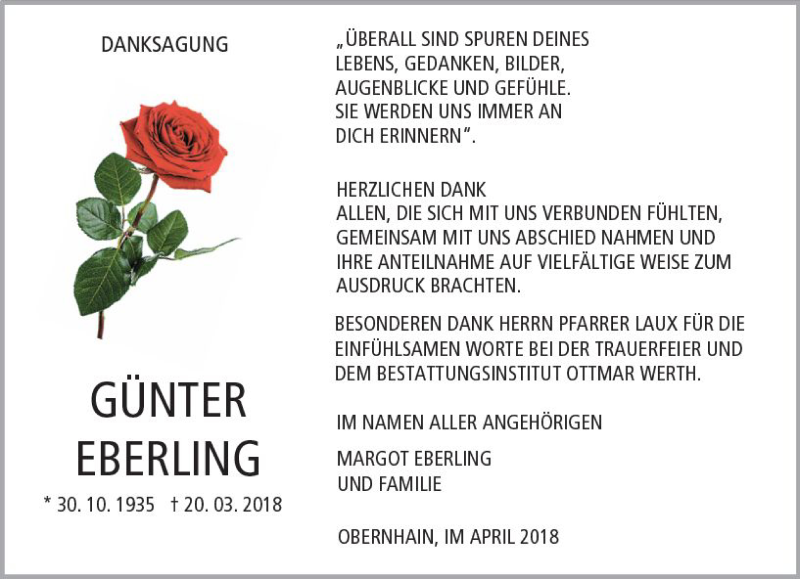 Hier finden Sie alle Traueranzeigen aus der Zeitung, die bisher für Günter Eberling erschienen sind. Weitere Traueranzeigen, die in der Zeitung erscheinen, werden hier ebenfalls aufgelistet