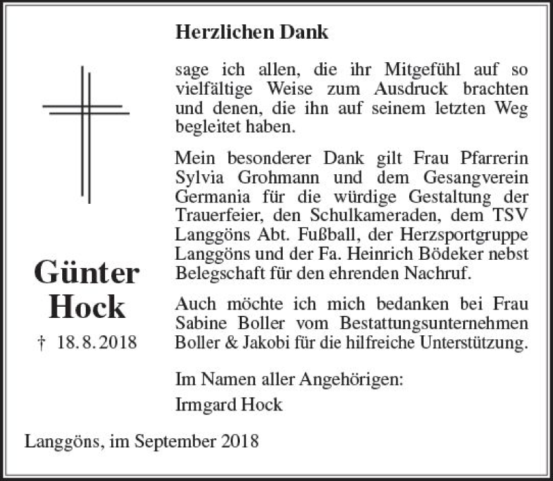 Hier finden Sie alle Traueranzeigen aus der Zeitung, die bisher für Günter Hock erschienen sind. Weitere Traueranzeigen, die in der Zeitung erscheinen, werden hier ebenfalls aufgelistet
