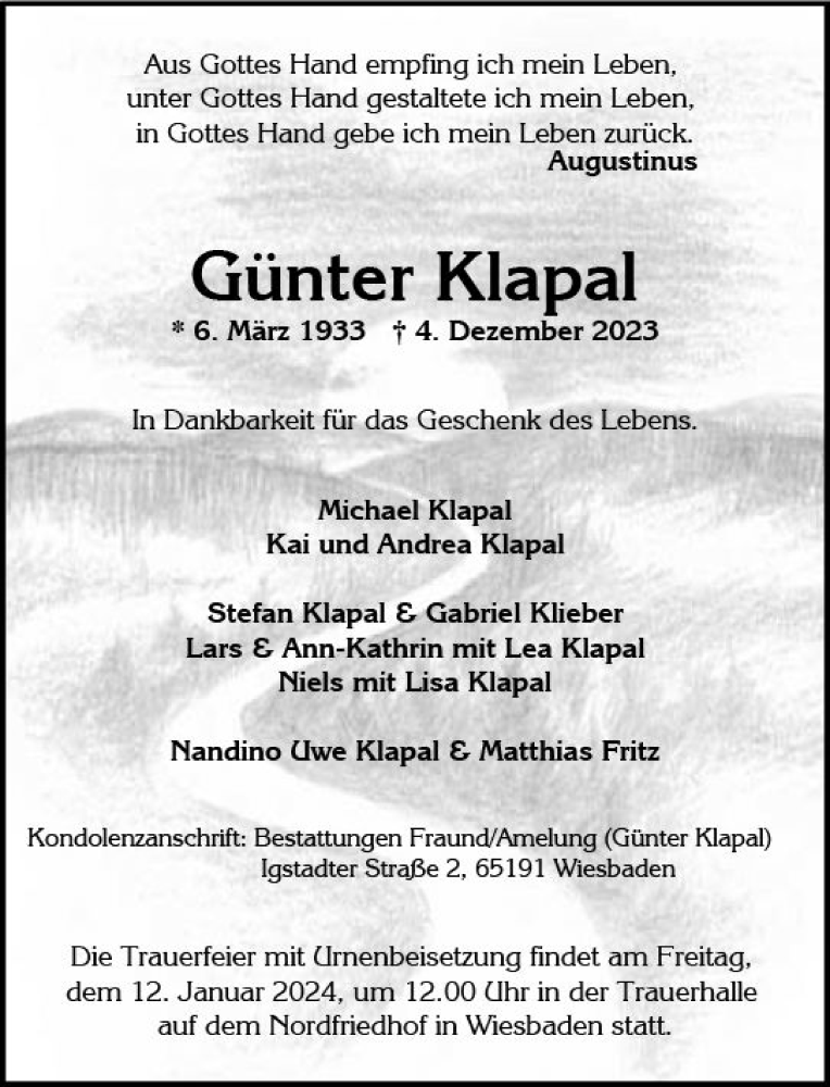 Hier finden Sie alle Traueranzeigen aus der Zeitung, die bisher für Günter Klapal erschienen sind. Weitere Traueranzeigen, die in der Zeitung erscheinen, werden hier ebenfalls aufgelistet