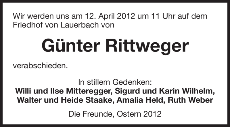 Hier finden Sie alle Traueranzeigen aus der Zeitung, die bisher für Günter Rittweger erschienen sind. Weitere Traueranzeigen, die in der Zeitung erscheinen, werden hier ebenfalls aufgelistet