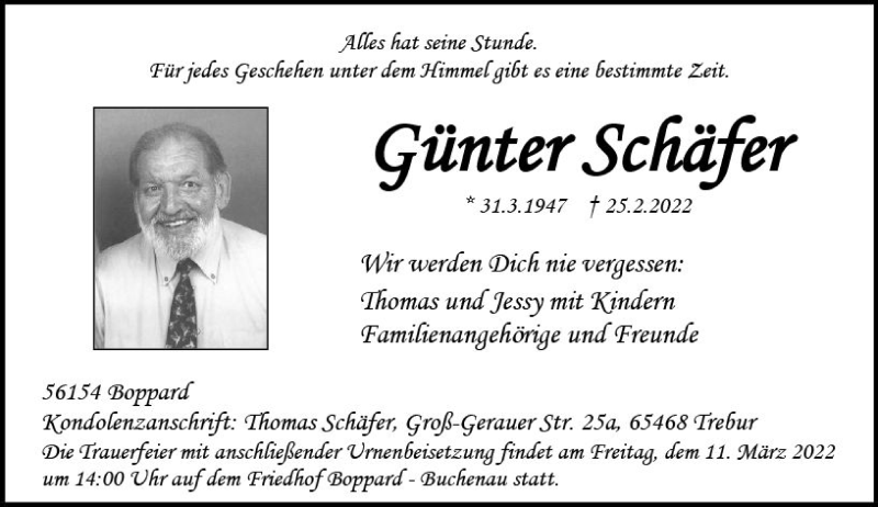 Hier finden Sie alle Traueranzeigen aus der Zeitung, die bisher für Günter Schäfer erschienen sind. Weitere Traueranzeigen, die in der Zeitung erscheinen, werden hier ebenfalls aufgelistet