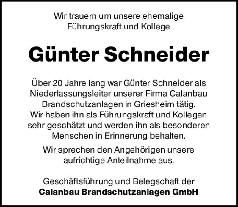 Hier finden Sie alle Traueranzeigen aus der Zeitung, die bisher für Günter Schneider erschienen sind. Weitere Traueranzeigen, die in der Zeitung erscheinen, werden hier ebenfalls aufgelistet