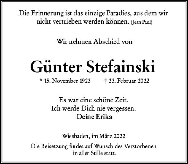 Hier finden Sie alle Traueranzeigen aus der Zeitung, die bisher für Günter Stefainski erschienen sind. Weitere Traueranzeigen, die in der Zeitung erscheinen, werden hier ebenfalls aufgelistet