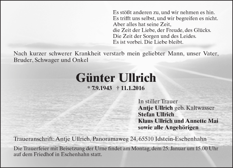 Hier finden Sie alle Traueranzeigen aus der Zeitung, die bisher für Günter Ullrich erschienen sind. Weitere Traueranzeigen, die in der Zeitung erscheinen, werden hier ebenfalls aufgelistet