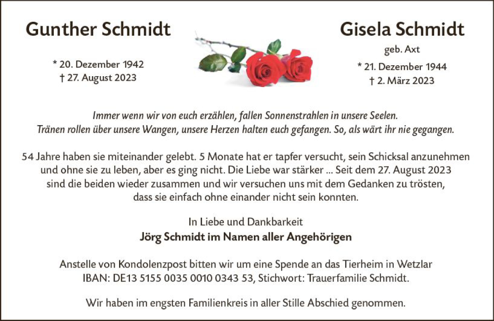 Hier finden Sie alle Traueranzeigen aus der Zeitung, die bisher für Gunther und Gisela Schmidt erschienen sind. Weitere Traueranzeigen, die in der Zeitung erscheinen, werden hier ebenfalls aufgelistet
