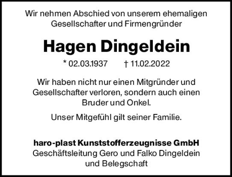 Hier finden Sie alle Traueranzeigen aus der Zeitung, die bisher für Hagen Dingeldein erschienen sind. Weitere Traueranzeigen, die in der Zeitung erscheinen, werden hier ebenfalls aufgelistet