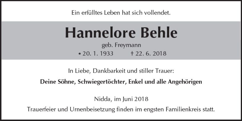 Hier finden Sie alle Traueranzeigen aus der Zeitung, die bisher für Hannelore Behle erschienen sind. Weitere Traueranzeigen, die in der Zeitung erscheinen, werden hier ebenfalls aufgelistet