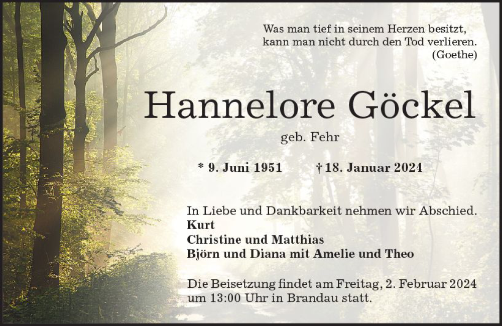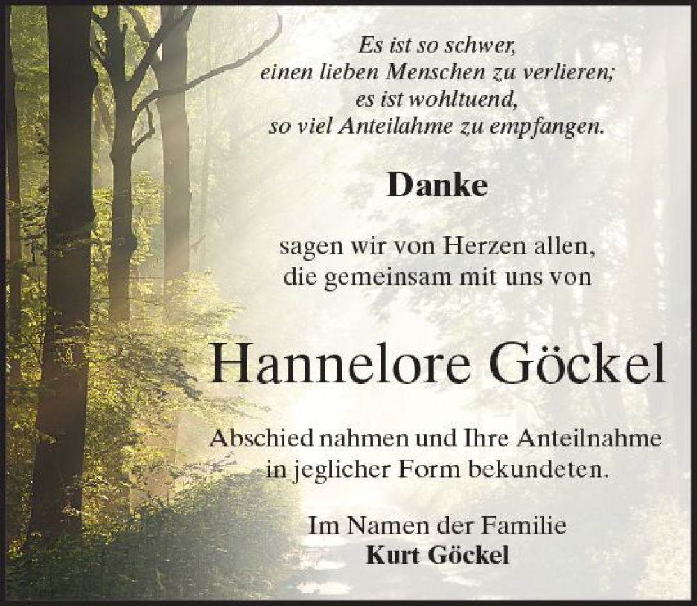 Hier finden Sie alle Traueranzeigen aus der Zeitung, die bisher für Hannelore Göckel erschienen sind. Weitere Traueranzeigen, die in der Zeitung erscheinen, werden hier ebenfalls aufgelistet
