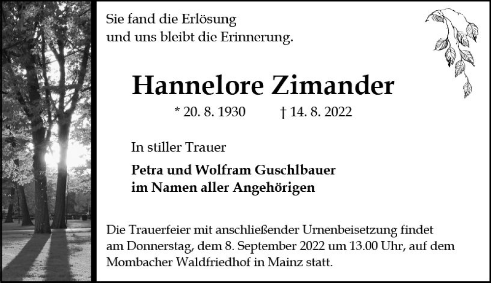 Hier finden Sie alle Traueranzeigen aus der Zeitung, die bisher für Hannelore Zimander erschienen sind. Weitere Traueranzeigen, die in der Zeitung erscheinen, werden hier ebenfalls aufgelistet