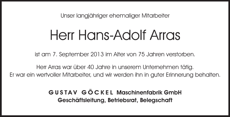 Hier finden Sie alle Traueranzeigen aus der Zeitung, die bisher für Hans-Adolf Arras erschienen sind. Weitere Traueranzeigen, die in der Zeitung erscheinen, werden hier ebenfalls aufgelistet