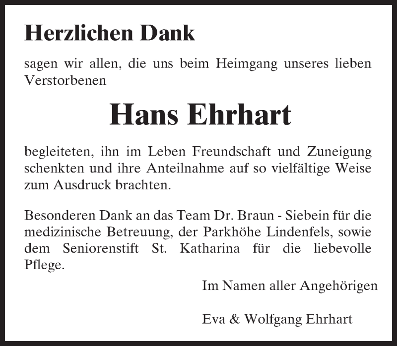 Hier finden Sie alle Traueranzeigen aus der Zeitung, die bisher für Hans Ehrhart erschienen sind. Weitere Traueranzeigen, die in der Zeitung erscheinen, werden hier ebenfalls aufgelistet