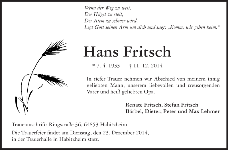 Hier finden Sie alle Traueranzeigen aus der Zeitung, die bisher für Hans Fritsch erschienen sind. Weitere Traueranzeigen, die in der Zeitung erscheinen, werden hier ebenfalls aufgelistet