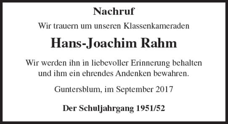 Hier finden Sie alle Traueranzeigen aus der Zeitung, die bisher für Hans-Joachim Rahm erschienen sind. Weitere Traueranzeigen, die in der Zeitung erscheinen, werden hier ebenfalls aufgelistet
