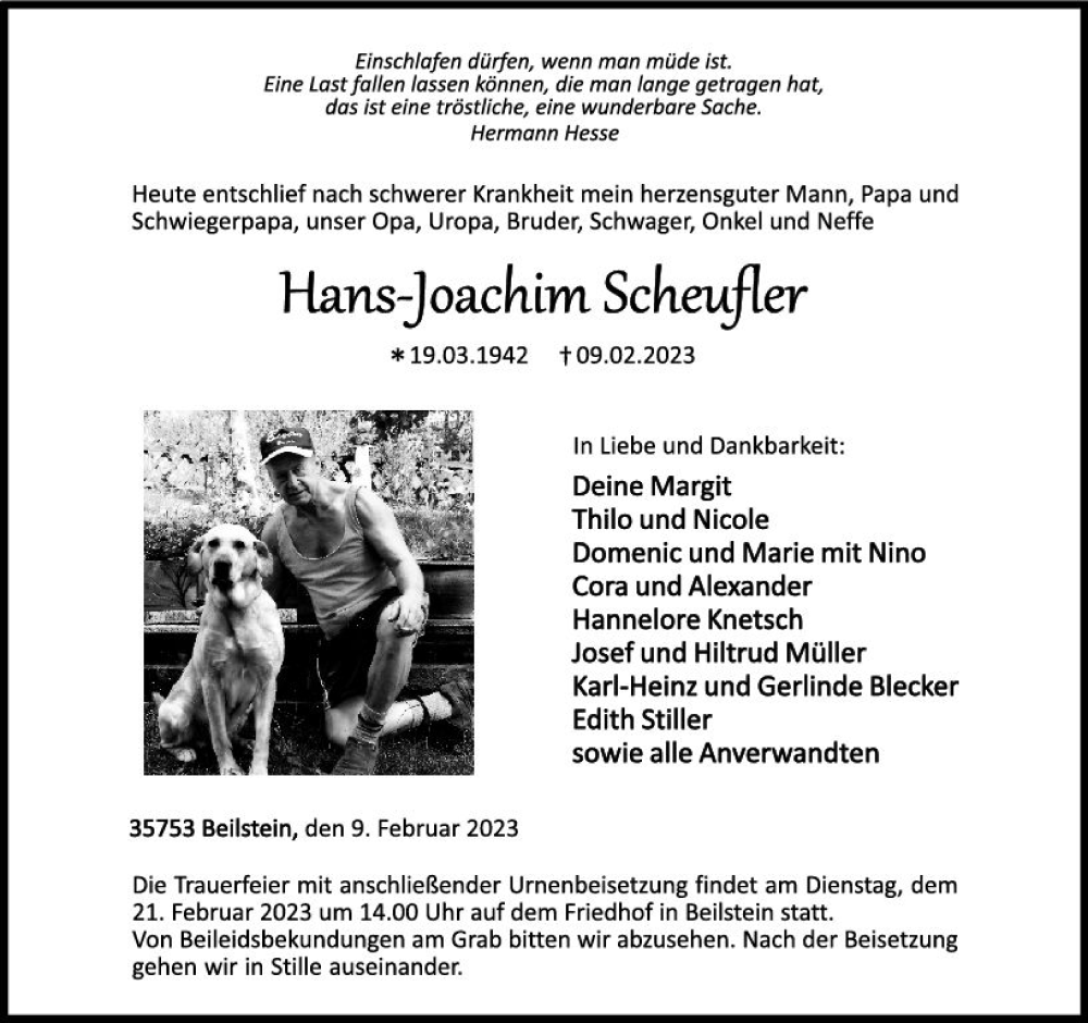 Hier finden Sie alle Traueranzeigen aus der Zeitung, die bisher für Hans-Joachim Scheufler erschienen sind. Weitere Traueranzeigen, die in der Zeitung erscheinen, werden hier ebenfalls aufgelistet