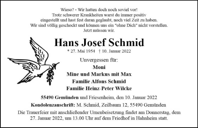 Hier finden Sie alle Traueranzeigen aus der Zeitung, die bisher für Hans Josef Schmid erschienen sind. Weitere Traueranzeigen, die in der Zeitung erscheinen, werden hier ebenfalls aufgelistet