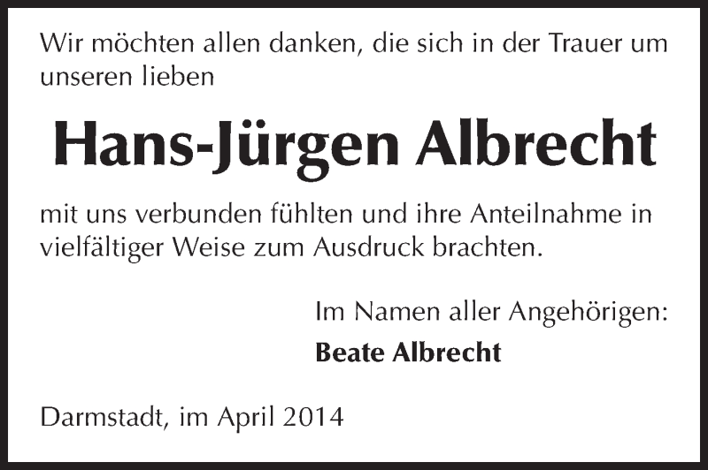 Hier finden Sie alle Traueranzeigen aus der Zeitung, die bisher für Hans-Jürgen Albrecht erschienen sind. Weitere Traueranzeigen, die in der Zeitung erscheinen, werden hier ebenfalls aufgelistet