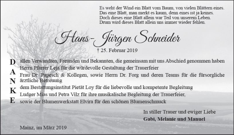 Hier finden Sie alle Traueranzeigen aus der Zeitung, die bisher für Hans-Jürgen Schneider erschienen sind. Weitere Traueranzeigen, die in der Zeitung erscheinen, werden hier ebenfalls aufgelistet