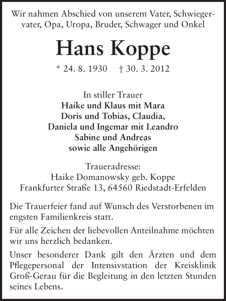 Hier finden Sie alle Traueranzeigen aus der Zeitung, die bisher für Hans Koppe erschienen sind. Weitere Traueranzeigen, die in der Zeitung erscheinen, werden hier ebenfalls aufgelistet