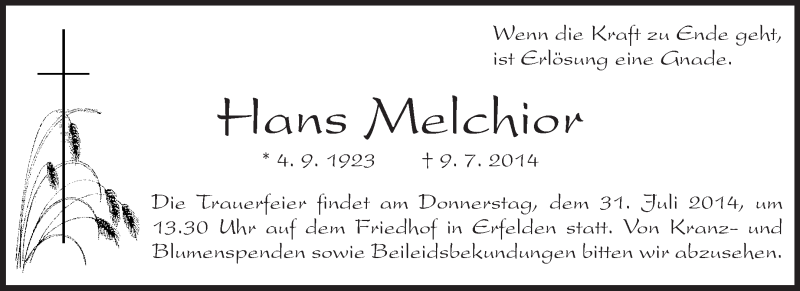 Hier finden Sie alle Traueranzeigen aus der Zeitung, die bisher für Hans Melchior erschienen sind. Weitere Traueranzeigen, die in der Zeitung erscheinen, werden hier ebenfalls aufgelistet
