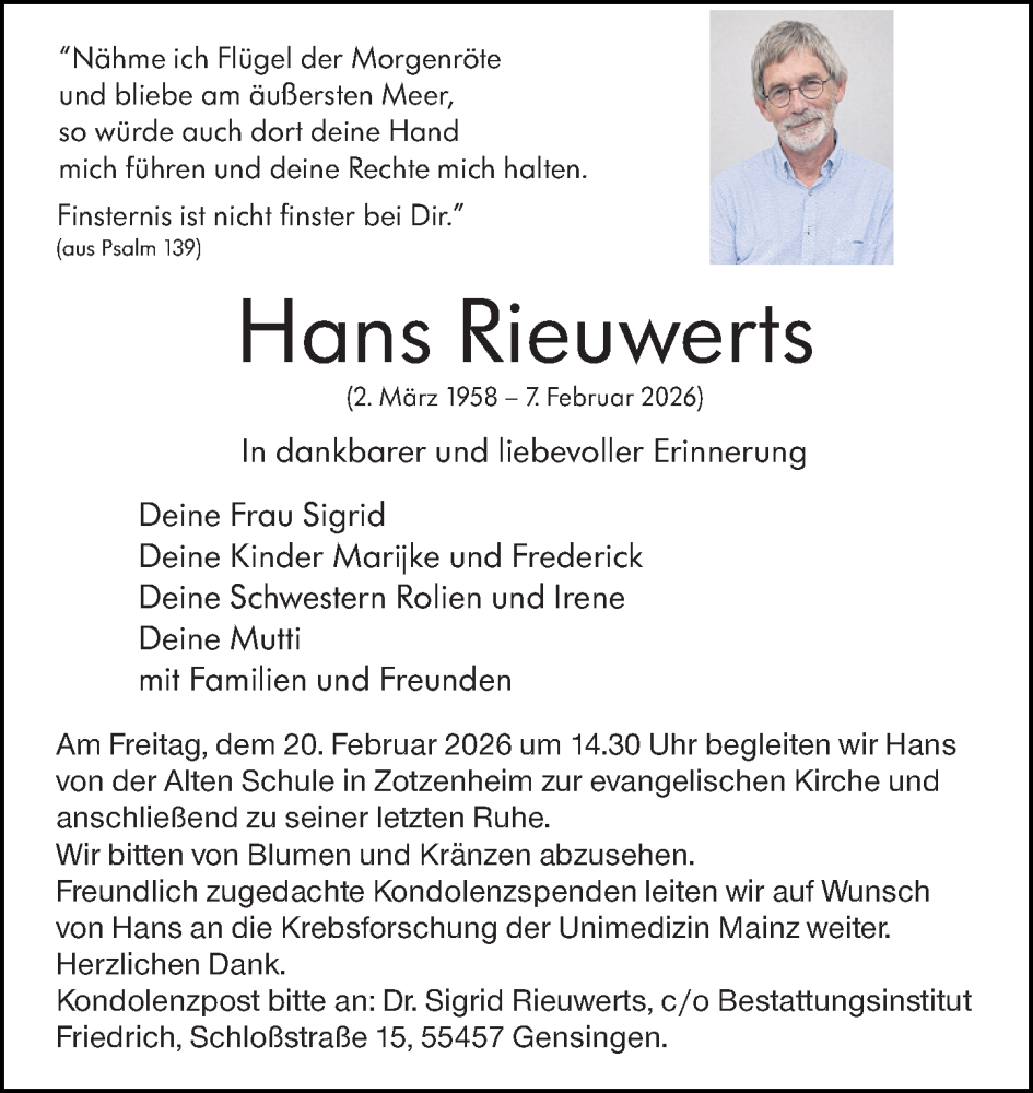 Hier finden Sie alle Traueranzeigen aus der Zeitung, die bisher für Hans Rieuwerts erschienen sind. Weitere Traueranzeigen, die in der Zeitung erscheinen, werden hier ebenfalls aufgelistet