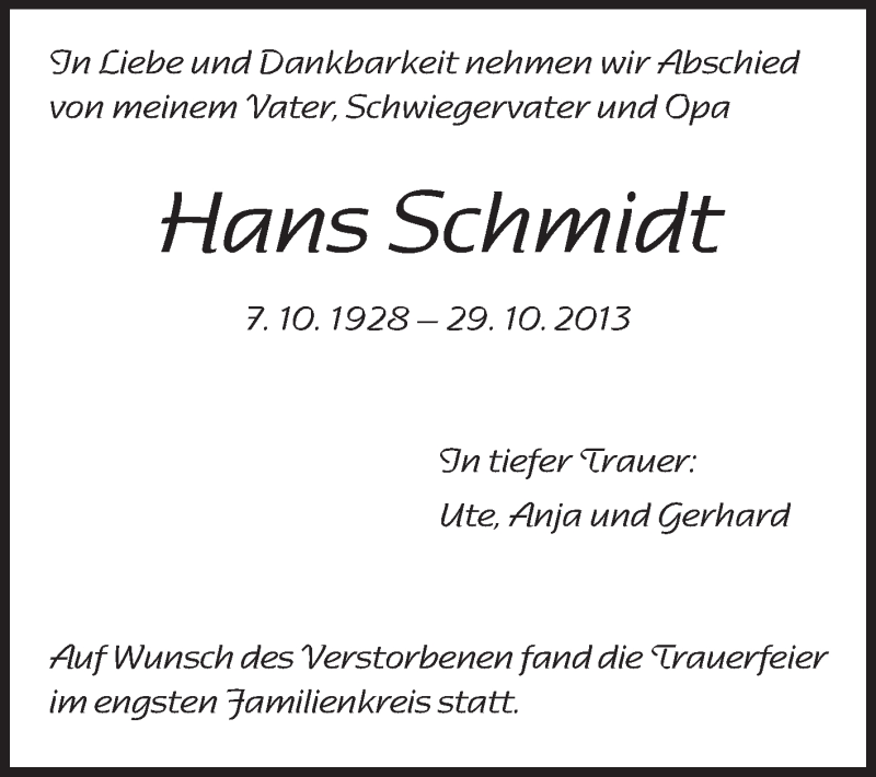 Hier finden Sie alle Traueranzeigen aus der Zeitung, die bisher für Hans Schmidt erschienen sind. Weitere Traueranzeigen, die in der Zeitung erscheinen, werden hier ebenfalls aufgelistet
