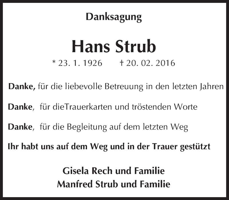 Hier finden Sie alle Traueranzeigen aus der Zeitung, die bisher für Hans Strub erschienen sind. Weitere Traueranzeigen, die in der Zeitung erscheinen, werden hier ebenfalls aufgelistet