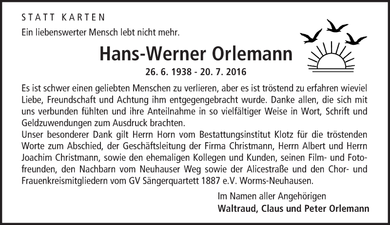 Hier finden Sie alle Traueranzeigen aus der Zeitung, die bisher für Hans-Werner Orlemann erschienen sind. Weitere Traueranzeigen, die in der Zeitung erscheinen, werden hier ebenfalls aufgelistet