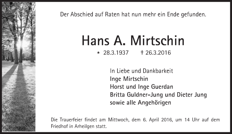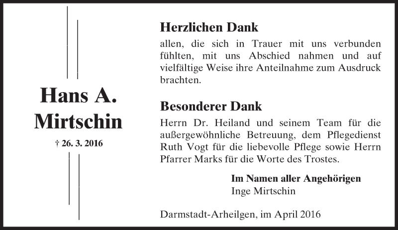 Hier finden Sie alle Traueranzeigen aus der Zeitung, die bisher für Hans A. Mirtschin erschienen sind. Weitere Traueranzeigen, die in der Zeitung erscheinen, werden hier ebenfalls aufgelistet