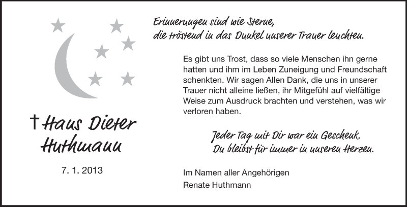 Hier finden Sie alle Traueranzeigen aus der Zeitung, die bisher für Hans Dieter Huthmann erschienen sind. Weitere Traueranzeigen, die in der Zeitung erscheinen, werden hier ebenfalls aufgelistet