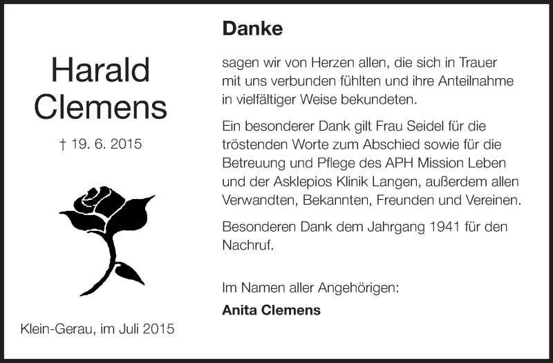Hier finden Sie alle Traueranzeigen aus der Zeitung, die bisher für Harald Clemens erschienen sind. Weitere Traueranzeigen, die in der Zeitung erscheinen, werden hier ebenfalls aufgelistet