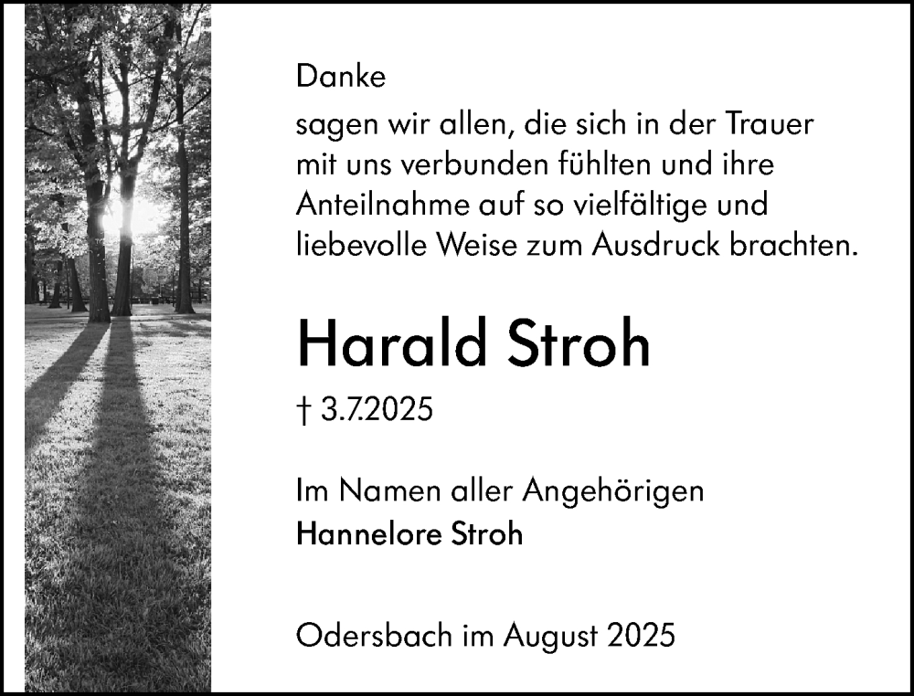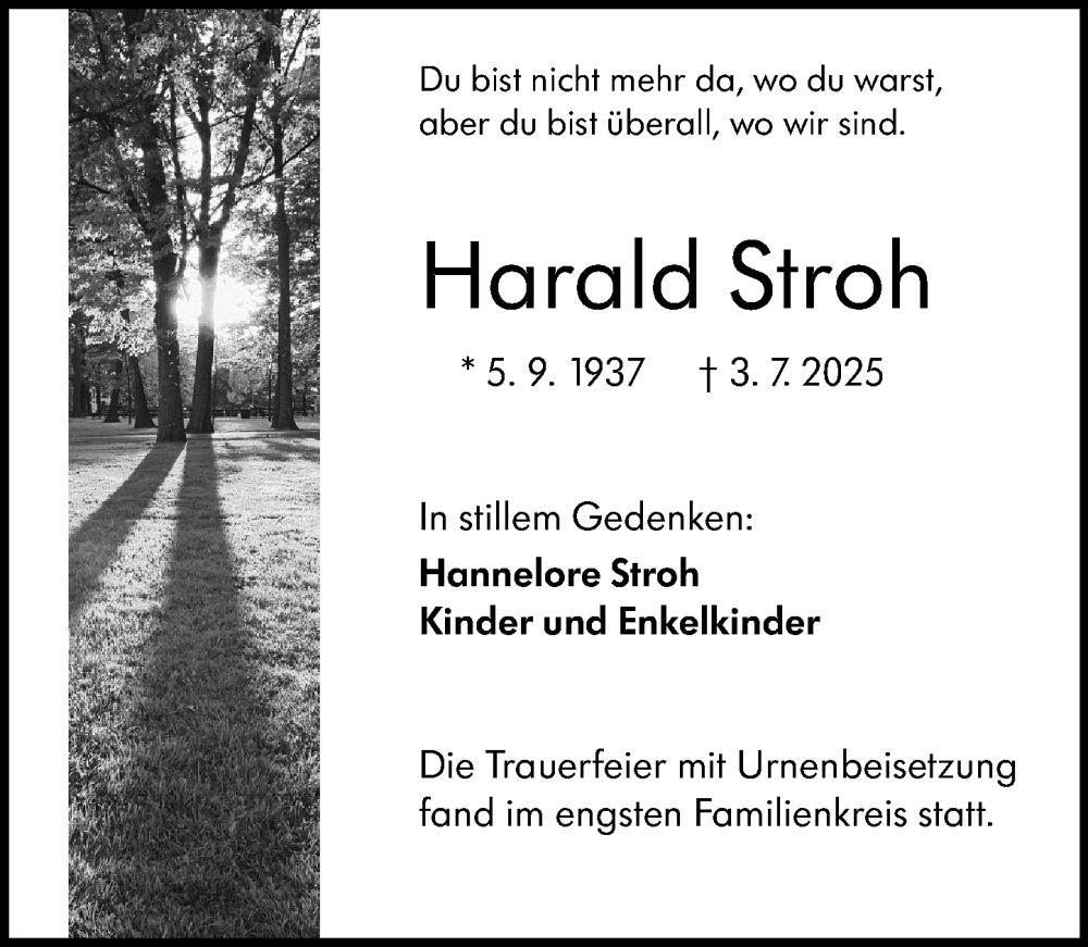 Hier finden Sie alle Traueranzeigen aus der Zeitung, die bisher für Harald Stroh erschienen sind. Weitere Traueranzeigen, die in der Zeitung erscheinen, werden hier ebenfalls aufgelistet