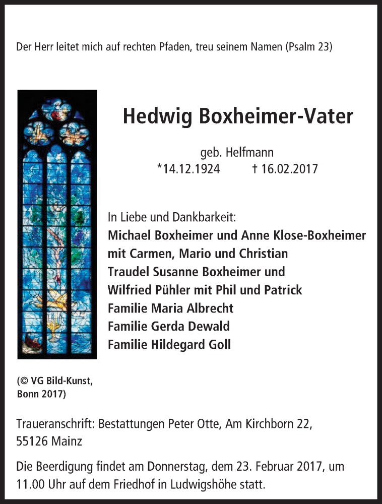 Hier finden Sie alle Traueranzeigen aus der Zeitung, die bisher für Hedwig Boxheimer-Vater erschienen sind. Weitere Traueranzeigen, die in der Zeitung erscheinen, werden hier ebenfalls aufgelistet